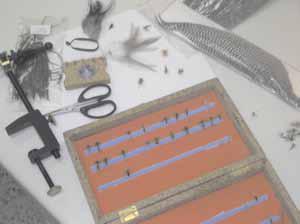 Precisamos anzuelos, brinca (especie de tanza), seda que usamos para hacer las rayas del mosquito, estas son de varios colores, así se asemejan muchísimo debajo del agua a los verdaderos mosquitos. También usamos un torno que nos sirve de soporte para poder manipularlas, recuerda que estamos hablando de piezas muy pequeñas.