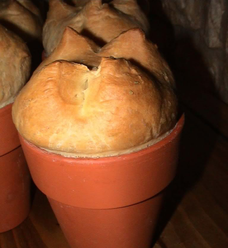 Untar ligeramente de aceite 2 macetas de barro bien limpias, de un diámetro de 14 cm. y 11 cm. de altura. Tamizar los dos tipos de harina con la sal en un bol y hacer un volcán en el centro. Mezclar la levadura con un poco de leche hasta estar blanda, y luego añadir el resto de la leche. Verter esta mixtura líquida en el cráter del volcán y echar por encima un poco de harina del borde. Cubrir el bol y dejar en reposo en lugar cálido durante unos 15 minutos.