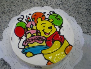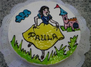 Una vez seco el dibujo, hay que pasarlo a la tarta (congelada, que habremos colocado en bandeja con blonda), volcándolo con decisión y pasando la mano sobre el plástico para que se fije bien.