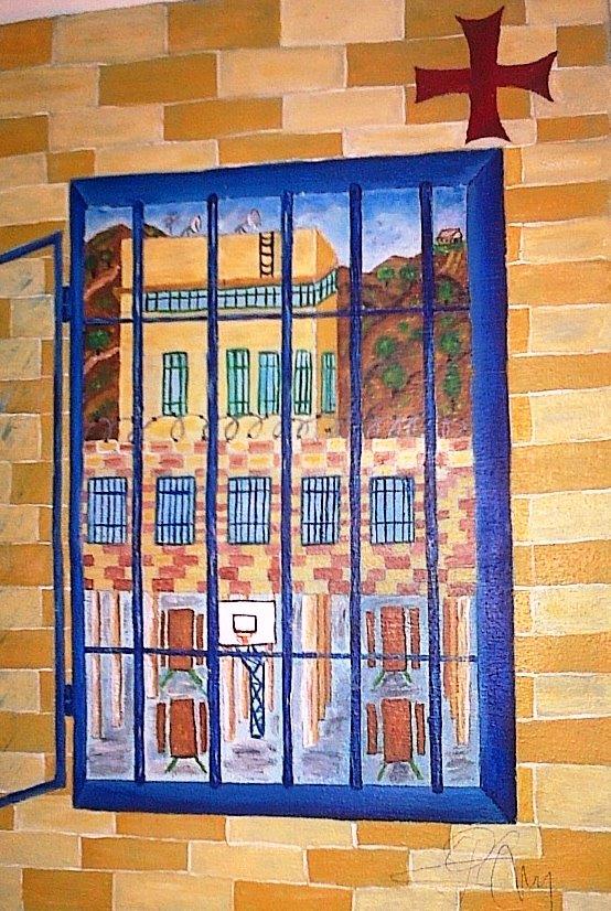 Petrache, interno en el C.P. de Daroca (Zaragoza), en soporte de tela de sábana usada, respetando el medio ambiente y el reciclaje, utilizando la técnica del acrílico, ha realizado un trabajo que titula: “desde mi celda” que ha sido elegido por los organizadores del evento para ilustrar el cartel anuncio de la Exposición Nacional Itinerante Presos de las Bellas Artes y Artesanía que, del 21 de julio al 25 de agosto, fechas de máxima afluencia turística del municipio, tendrá por escenario la Casa de la Cultura darocense, cedida por el Exmª Ayuntamiento de la localidad, editor, y distribuidor del documento gráfico, en el que el artista plasma la panorámica que ve desde su celda, e ilustra con una cruz de la Ocho Beatitudes, en reconocimiento a los Templarios de Jumilla, impulsores del evento, que cuenta con la colaboración del Exmª Ayuntamiento de Daroca, Centro Penitenciario local, Ministerio del Interior – Secretaría General de Instituciones Penitenciarias (SGIP), y la Associació Cultural Jumillana (Barcelona), además de una serie de empresas privadas que apuestan por la reinserción del internado, por medio de las Bellas Artes y Artesanía, como terapia formativa que estimule la autoestima de las personas sujetas a períodos de privación de libertad en cumplimiento de la pena impuesta, sumándose con ello a la política de la SGIP en preparar el interno, mediante una serie de actividades desarrolladas en las áreas socioculturales, para cuando sea devuelto a la sociedad lo haga en las mejores condiciones posibles.