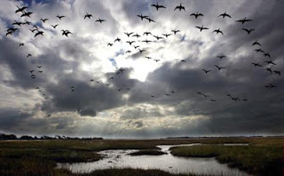 De pronto, con gran asombro y admiración, observó a lo lejos en lo alto de las tierras de labranza, una enorme bandada de aves migratorias. Escuadrilla con los cuellos alargados, sus plumas vivamente coloreadas, un tanto oscurecidas de tonos marrones las puntas, con claras marcas conspícuas en las alas y cola, sirviendo éstas para mantener unida la bandada. El grupo denotaba una verdadera jerarquía social con su peculiar formación, apreciándose claramente que esa ruta se presentaba larga, aún estando ésta jalonada con lugares de descanso y con apreciación de no ser éste el más propicio para ello, un vivaz aleteo despidiendo y desvaneciéndose a un mismo son de la zona invernal.
