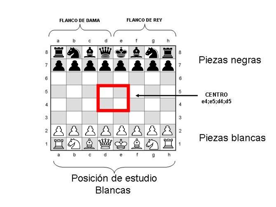 Pero claro, nos queda saber que hacer al comenzar con todas las piezas puestas en la posición inicial, pues siempre hay que tratar de jugar hacia el centro, hacia las casillas centrales: e4, d4, e5 y d5
