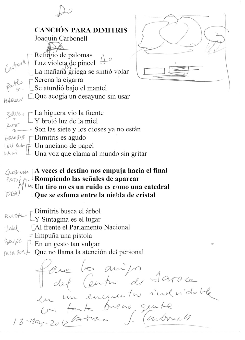 El cantante, periodista y escritor Joaquín Carbonell, quien nos ha visitado en varias ocasiones memorables para lances literarios, en mayo de 2012, abril y octubre de 2013, realizando magníficas exposiciones de sus dos obras «Aragón a la brasa» y «Querido Labordeta«, cedió amablemente en ambas ocasiones a las peticiones y ruegos abundantes de los presentes, quienes con guitarra en mano le implorábamos que nos deleitara con un mini recital de su repertorio musical.