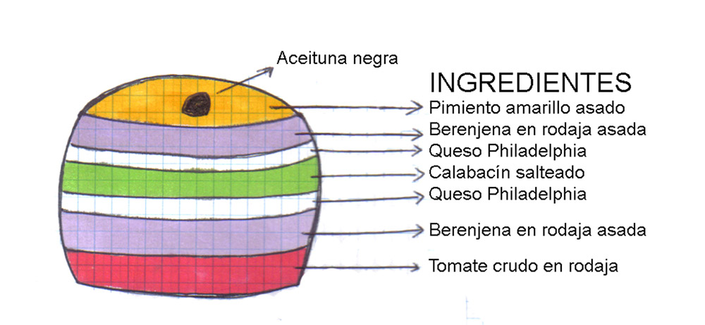– Utilizar un molde o pequeña tarrina de plástico redonda, untar un poco de aceite en la misma, poner en primer lugar el pimiento, una pequeña capa de crema de queso, una rodaja de berenjena, otra pequeña capa de queso, una capa de rodajitas de calabacín del grosor aproximado de la berenjena, otra rodaja de berenjena y por último una rodaja de tomate.