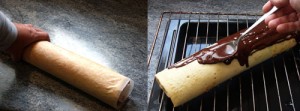 - Colocar el tronco sobre una rejilla con una bandeja debajo y bañar con la trufa cocida. Dibujar con un tenedor, simulando un tronco. Pasar a una bandeja y pegar las ramas también bañadas y peinadas con el tenedor.
