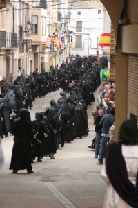 Es un no parar. Aquí no hay cofradías. Son cuadrillas que no dejan de anunciar que Jesucristo va a morir. Piensen por un momento en 2.000 instrumentos sonando a la vez. Albalate, Alcorisa, Alcañíz, Andorra, Calanda, Híjar, La Puebla de Híjar, Samper de Calanda y Urrea son los 9 pueblos que componen esa ruta. Muchos son los que van y repiten. Es imposible no dejarse llevar por ese sonar profundo. Las cuadrillas no son parte de ninguna de las iglesias, colaboran en los distintos actos religiosos, pero van aparte. La Iglesia recurre a ellos. Inolvidable es el acto religioso en la colosal iglesia de Samper cuando los alabarderos, haciendo sonar sus cornetas, acompañan al sacerdote hasta el Monumento.
