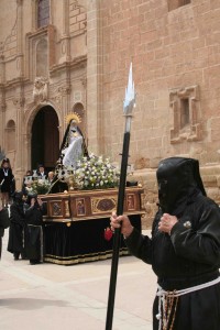 Durante estos días se suceden, asimismo, las celebraciones religiosas. Ya el Domingo de Ramos, se entran a la Iglesia las imágenes del Calvario. Las cofradías portan con firmeza y guían sus “pasos”: «Entrada de Jesús», «Oración de Jesús en el Huerto», «San Juan», «Jesús atado a la columna», «Coronación de espinas», «El Nazareno», «Cristo en la cruz», «El Descendimiento», «La Dolorosa» y «Cristo Yaciente», siempre con la vigilante compañía de los Alabarderos romanos.