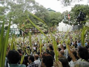 El Domingo de Ramos, todos nos reunimos, por la mañana, en un sitio con palmas u olivos. Allí, las palmas son bendecidas y, posteriormente, vamos todos en procesión hacia la Iglesia en donde se realiza una celebración eucarística.